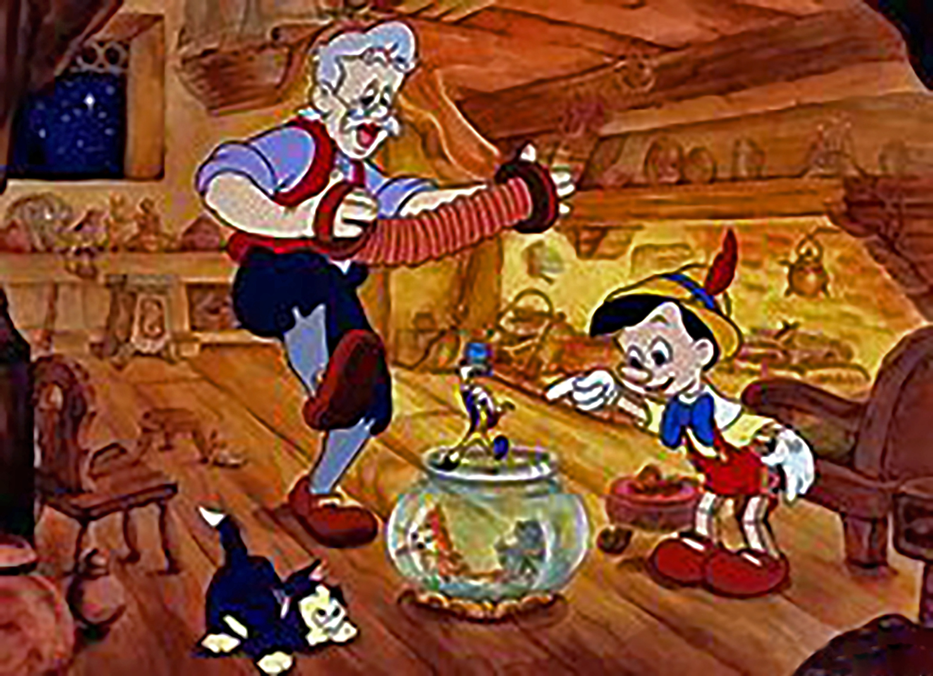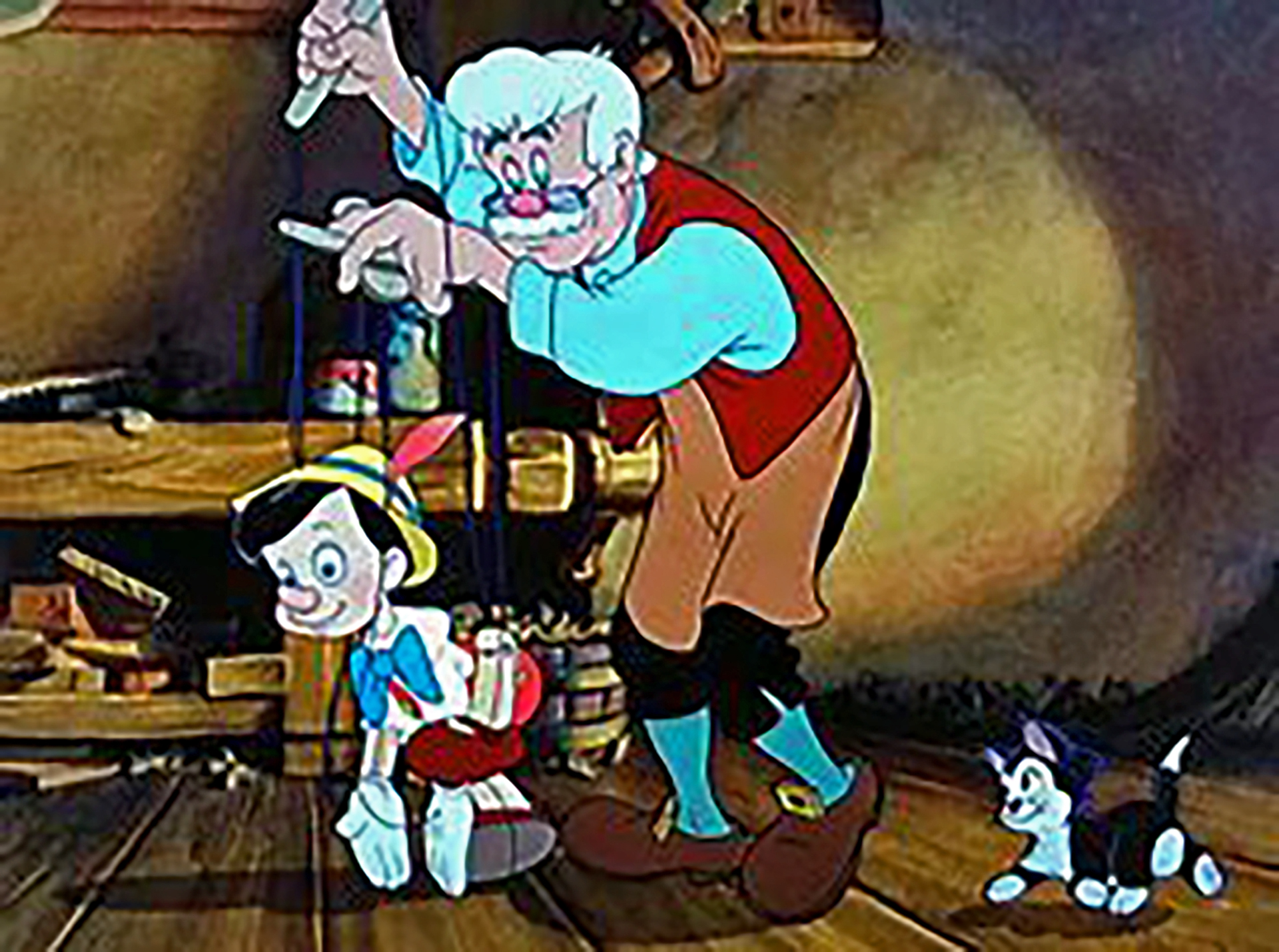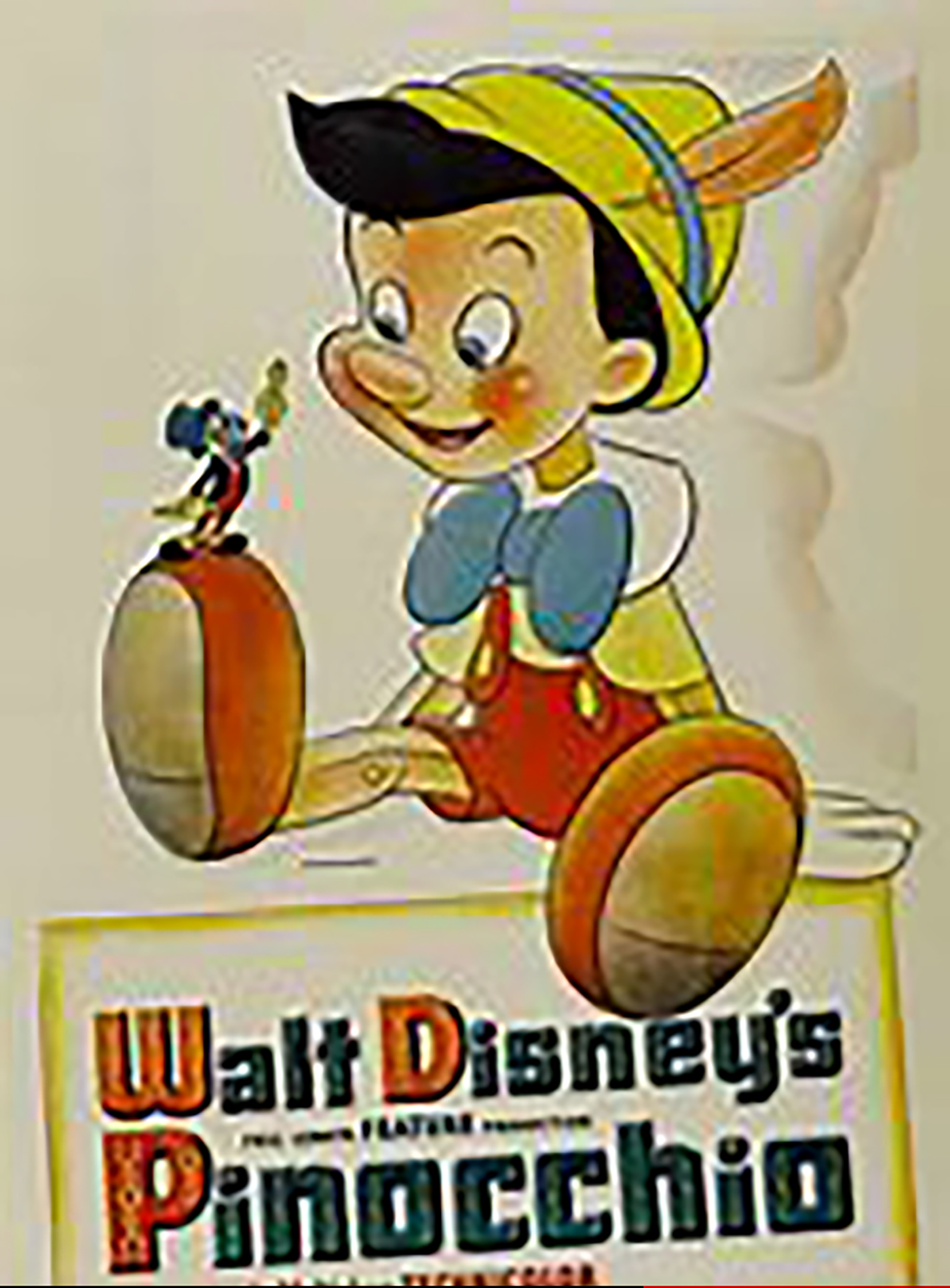 The Disney version of the story was released in theaters on February 7th, 1940. In the story, Pinocchio is brought to life by a blue fairy. Pinocchio longs to become a real live boy, and the fairy tells him that if he proves himself to be unselfish, brave and truthful he will succeed. Of course, Pinocchio becomes involved with many objectionable characters. The main difference from the original story is that Walt decided that the Talking Cricket or now “Jiminy Cricket” is not killed by Pinocchio and is assigned by the blue Fairy to act as his “Conscience” and keep him on the straight and narrow.