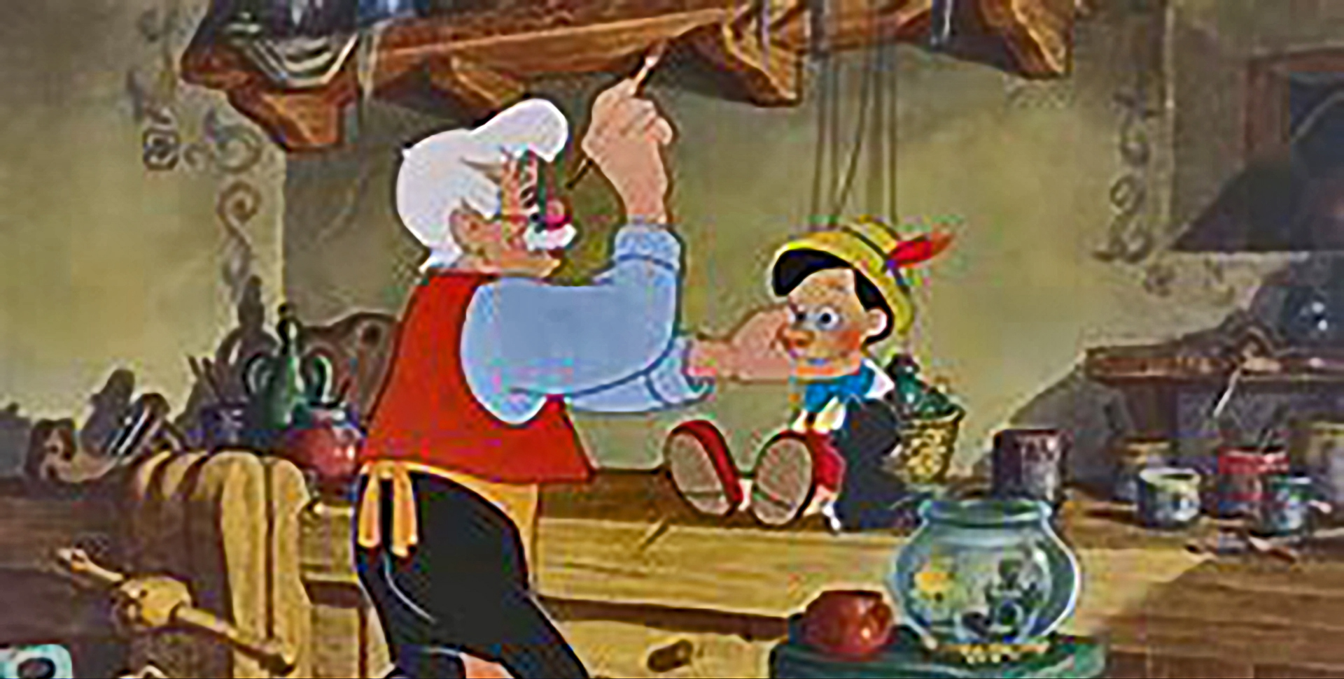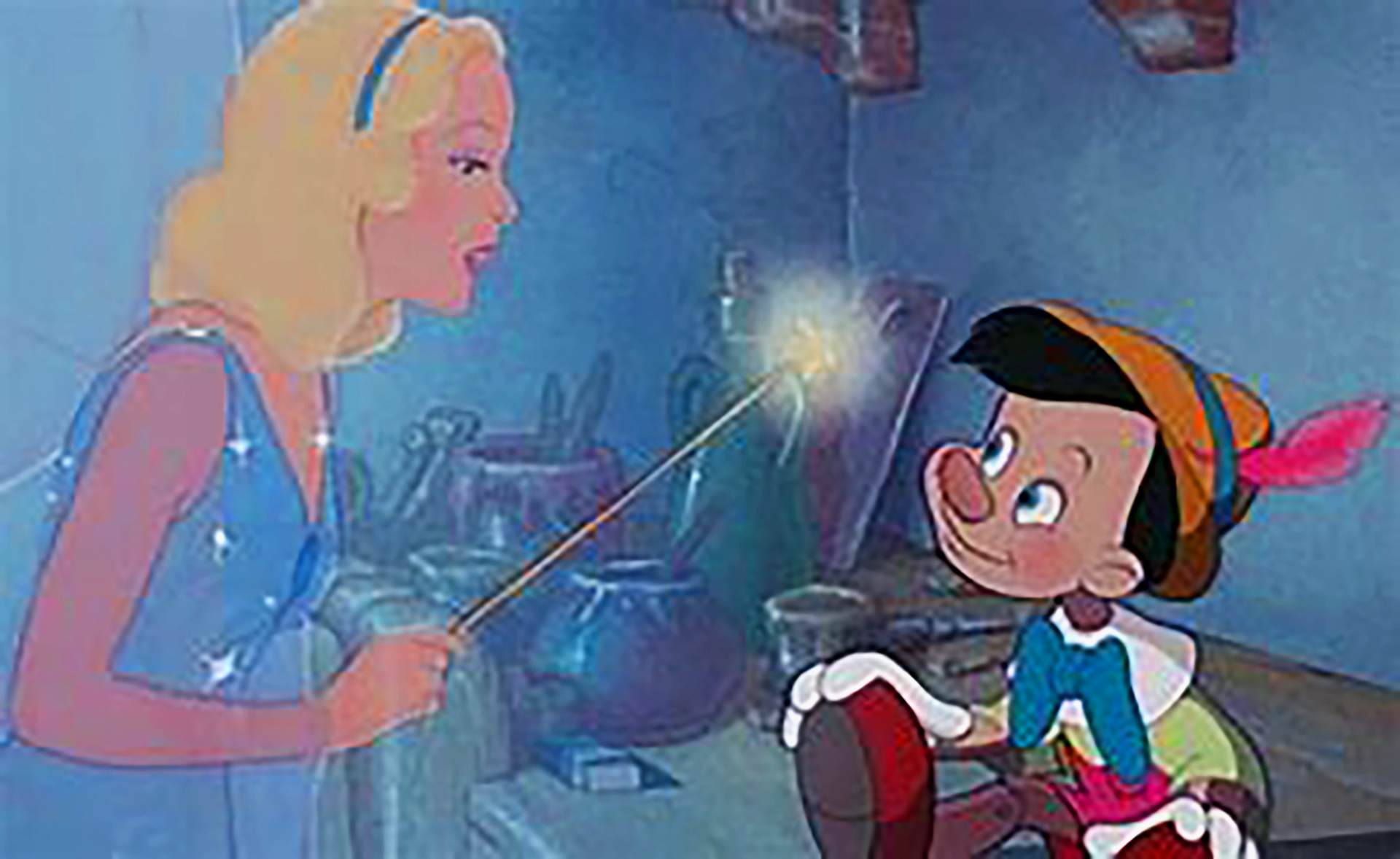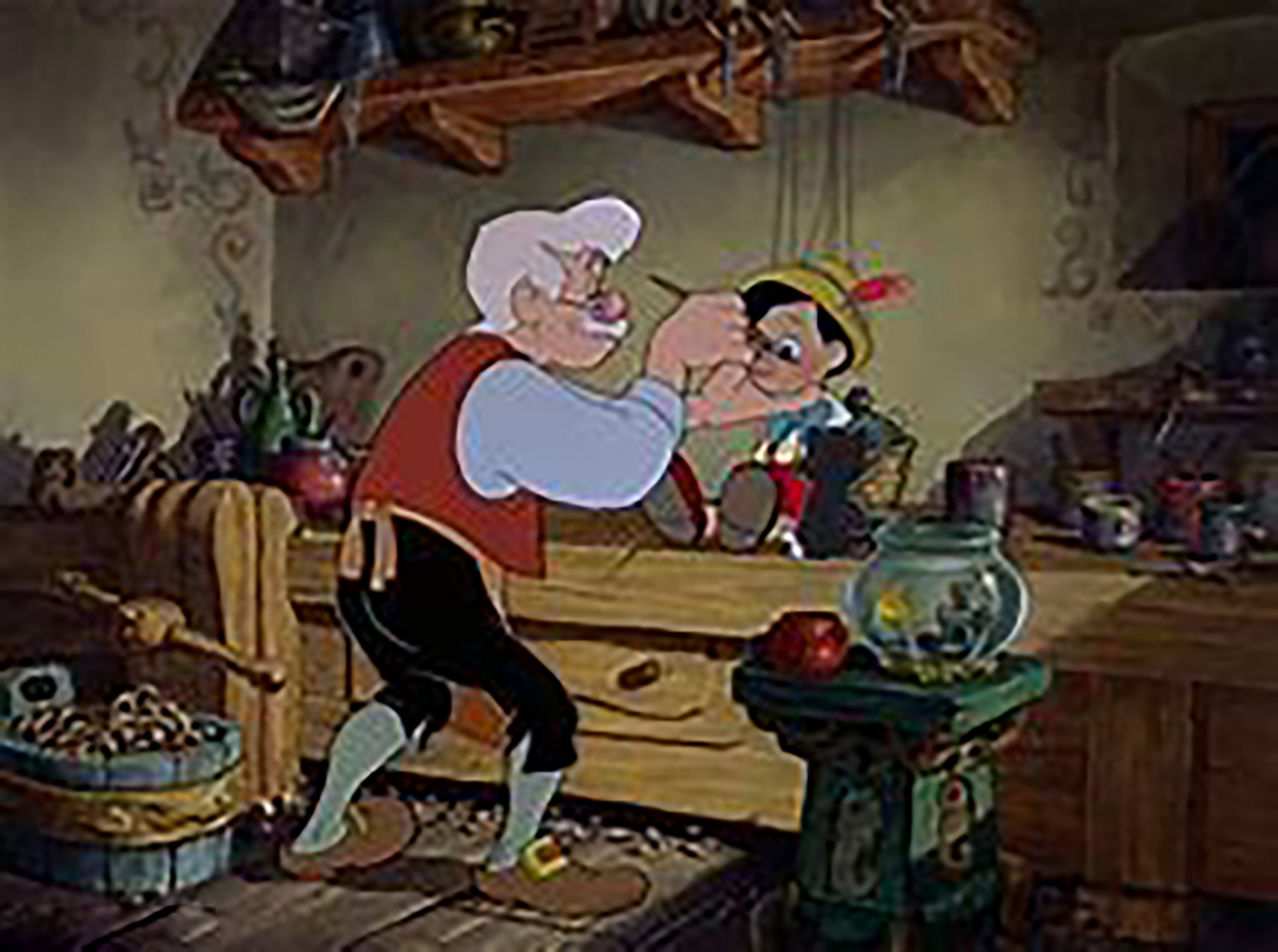 The Disney version of the story was released in theaters on February 7th, 1940. In the story, Pinocchio is brought to life by a blue fairy. Pinocchio longs to become a real live boy, and the fairy tells him that if he proves himself to be unselfish, brave and truthful he will succeed. Of course, Pinocchio becomes involved with many objectionable characters. The main difference from the original story is that Walt decided that the Talking Cricket or now “Jiminy Cricket” is not killed by Pinocchio and is assigned by the blue Fairy to act as his “Conscience” and keep him on the straight and narrow.