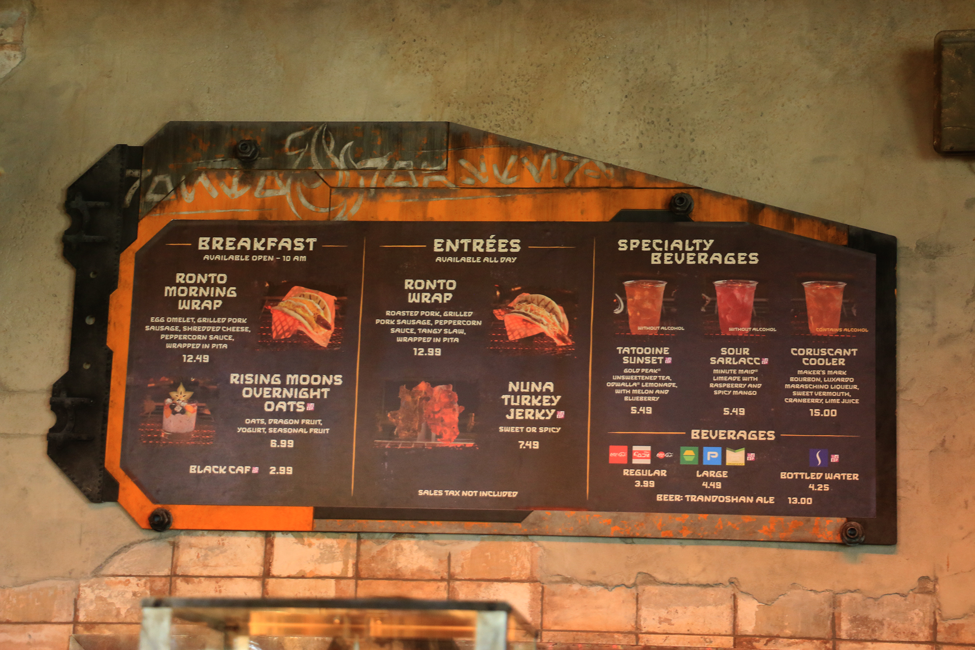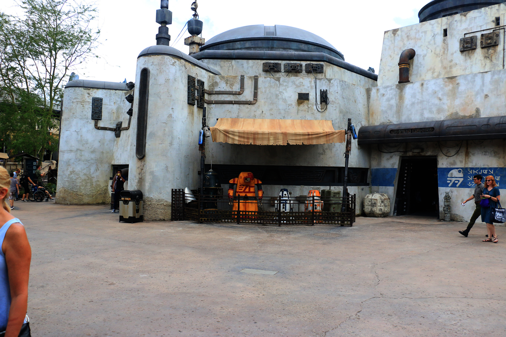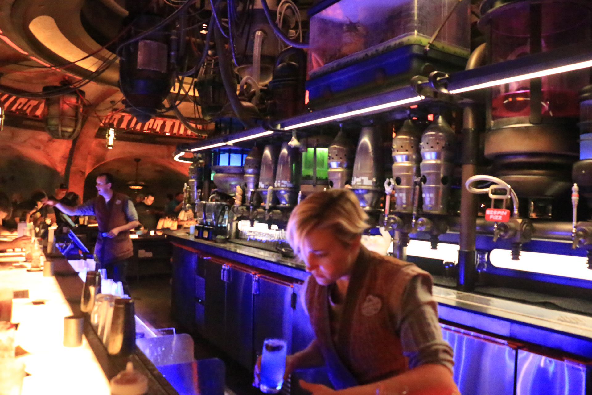 We loved Oga’s Cantina! Now remember, this is not the Mos Eisley Cantina in the Port of Mos Eisley on planet Tatoonie in the first Star Wars, A New Hope. You will not see that intergalactic band, but you will see the DJ R-3X (You will remember him as Captain Rex, again voiced by actor Paul Reubens) playing all your favorite Eighties synth-pop vibe tunes. There are Alcoholic and non-alcoholic offerings here. Again, take your time and observe all the amazing details and sights in the bar.