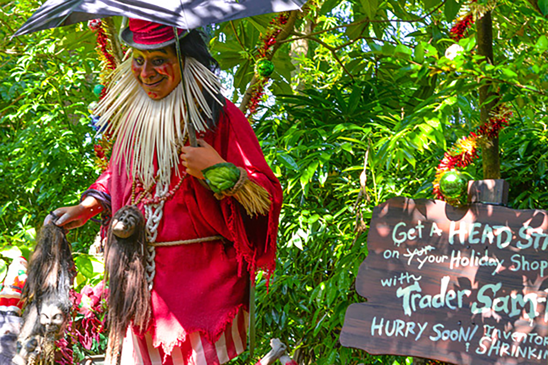 What’s in a name? How many sharp guests can remember that in Walt Disney World, until 2009, the Head salesman was called Chief Name” but now is “Trader Sam” as is in Disneyland? Well, here is the short story. Apparently, the writer of the script for WDW’s Jungle Cruise could not think of a name for the Chief, so just wrote “Chief Name” giving it to operations and thinking they would put one in. Well, operations held a contest to name the Chief and one skipper came up with “Chief Nah-Mee”, name! All thought it clever and by odd circumstances, was approved by Imagineering. Some of WDW’s skippers who vacationed in Disneyland liked some of their jokes and asked if they could be used in Florida. After some meetings with Imagineering, they not only approved the additional jokes, but decided to rectify the error in the script made many years ago. That is how Florida now has Trader Sam to coincide with Disneyland’s Jungle Cruise.
