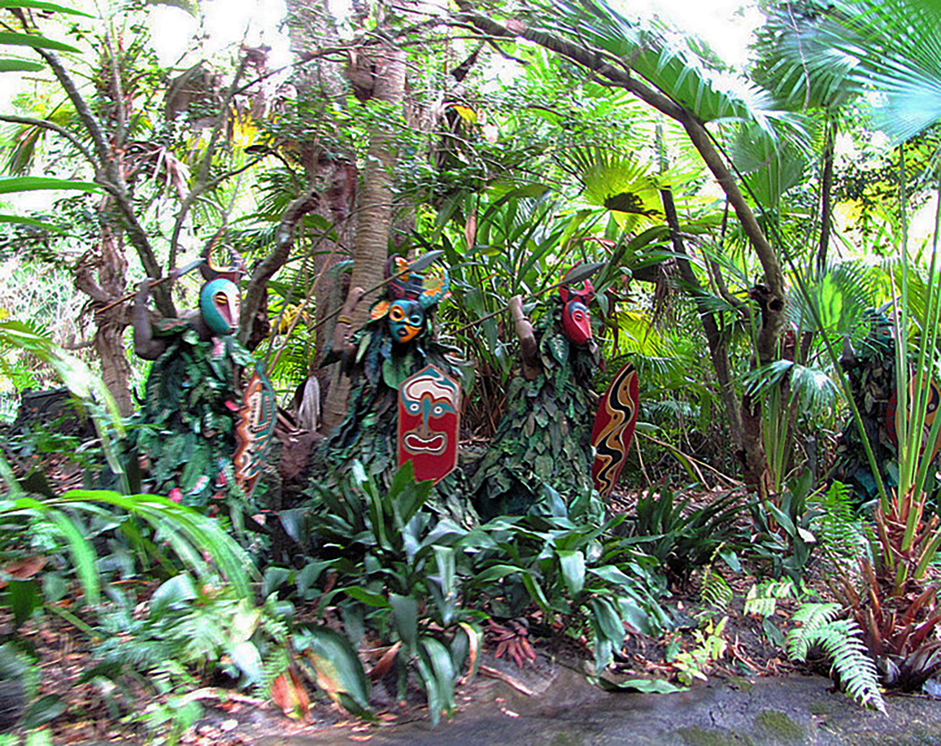 You now enter headhunter territory, seeing natives dancing around in a hut, and then natives on the shore, ambushing the boat. From here is the “Backside of Water” behind Schweitzer Falls. The boat enters the Mekong River, and through the ancient Cambodian temple ruins. Inside the temple, giant spiders and king cobras watch as you float by. After exiting the temple, you come across an elephant bathing pool where numerous elephants are relaxing in the water. You are warned by the skipper you could get a “bath” by an elephant as it squirt’s water from its trunk. The trip ends as you pass by Chief Name’ (More on WDW’s Chief’s name later), head salesman who will offer two of his shrunken heads for one of yours!