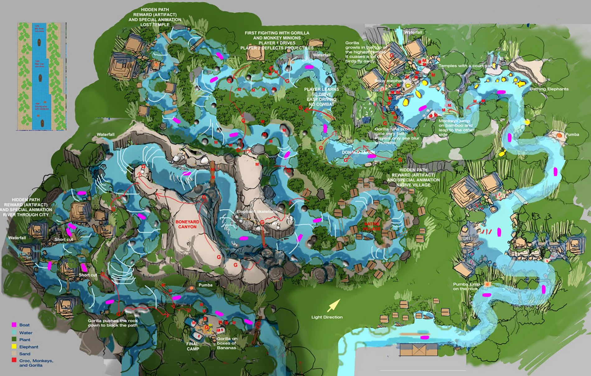 Bill Evans, Walt’s master Landscape Architect was the mastermind behind the attraction. He had to select a plethora of flora species that would be robust to counter Florida’s non-tropical mild winters, but still suggest a tropical feel. They need to appear correct, even if not normally grouped together. He had a herculean task of creating a believable jungle on a sparse budget. Aside from importing many actual tropical plants, he made wide use of “character plants” which, could give the appearance of exoticism in context. In a well-known trick, he uprooted local orange trees and “replanted” them upside-down, growing vines on the exposed roots. The Jungle Cruise has many sight gags, and no animator did it better than Marc Davis. He created Cruella De Ville, Princess Aurora and Tinker Bell. He had a flawless sense of timing, and his gag outlines often translated precisely into the attraction. The Indian Elephant Bathing Pool and Rhinoceros Chasing Explorers up a Pole were his contributions.