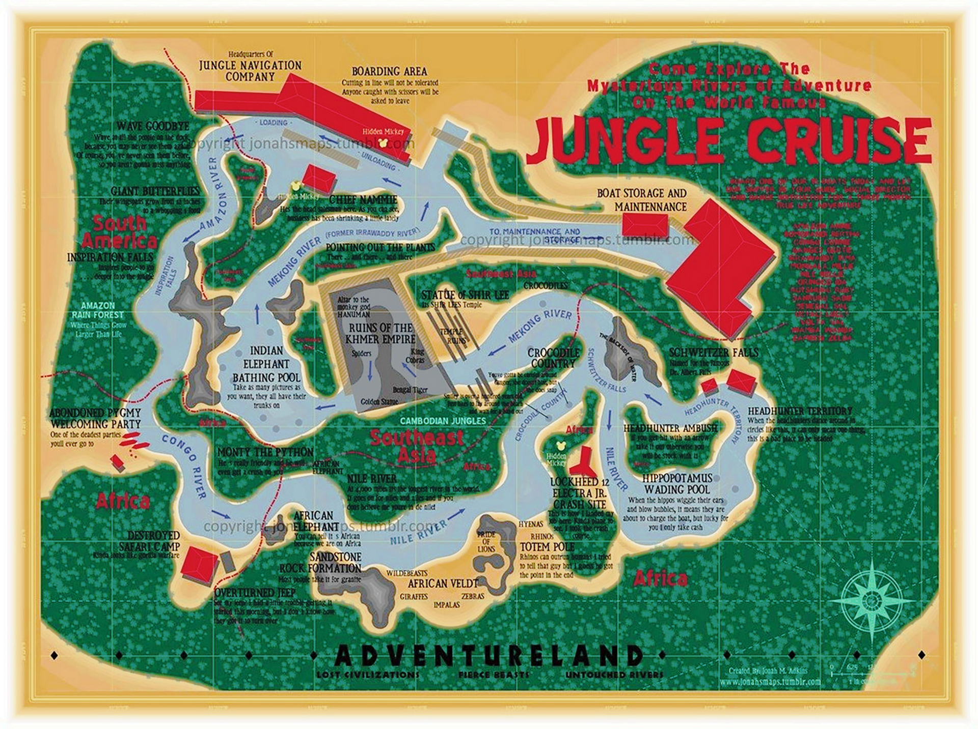 Here is the Disneyland Jungle Cruise itinerary…The outpost is again the Jungle Navigation Company, a British colony circa 1938. The queue has the period props and clutter, and routes upstairs. Period music plays along with jungle breaking news bulletins. In Disneyland, you first enter the Irrawaddy and Mekong rivers, aping Southwest Asia. You sail through a rainforest and enter the Temple of the Forbidden Eye, damaged by an ancient earthquake. Giant spiders, tigers, cobras and crocodiles are in evidence. You exit into the Sacred Indian Elephant Bathing pool, with elephants squirting water and bathing. African rivers are next, passing Schweitzer Falls, you enter the Nile, and approach the African Veldt with wildebeest, gazelles, giraffes, zebras and a pride of lions eating. Next up is the Rhino chasing the safari troupe up a pole. Now entering the Congo river and that pool of angry hippos, scared away with a gunshot by the skipper. You hear drums and chanting as native’s dance, then sail past an ambush from the river bank. You go under the “Backside of Water” and enter the Amazon, encountering a school of jumping piranha. Now guests pass water buffalo and a boa constrictor before meeting Trader Sam (Not Name’) who will give two of his heads for one of yours.