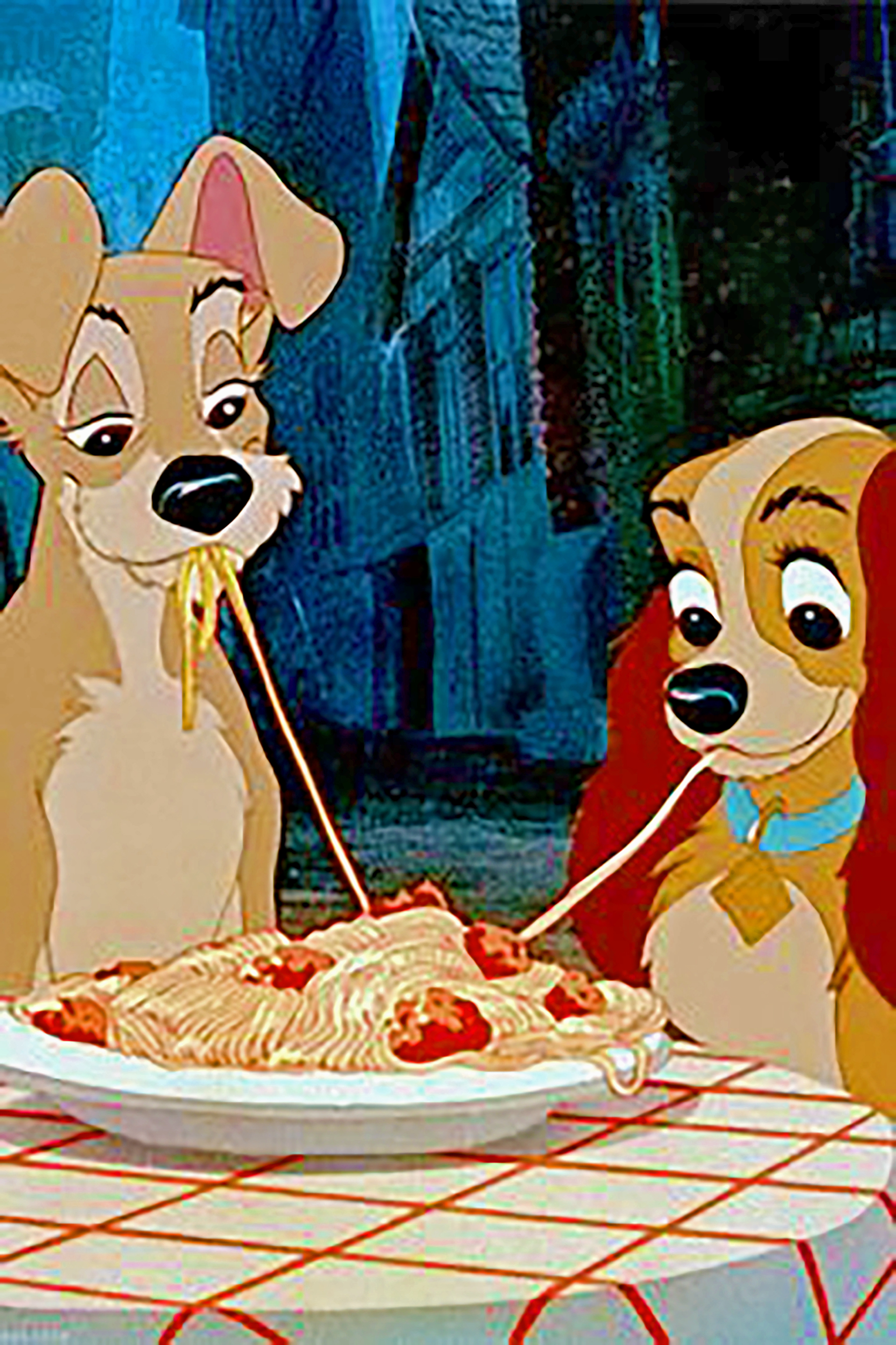 After forcing the muzzle on, Lady panics and runs away. Followed by two stray alley dogs, Tramp sees her peril and rescues her. Tramp takes Lady to a zoo and gets a beaver to bite off the muzzle. Previous, he tried to get an alligator to remove it, but he almost bit Lady’s head off. Tramp takes Lady around to neighborhood and showcases’ his owner and collar free lifestyle and tries to get Lady to join him. Later, in a most famous scene, he takes her to Tony’s Italian Restaurant where Tony and his assistant lavish a candle-lite spaghetti and meatball dinner on the couple, is where Tramp Kisses Lady. On the way back to Lady’ house, Tramp cajoles Lady to chase chickens in a coop. When fleeing, the dogcatcher snags Lady.