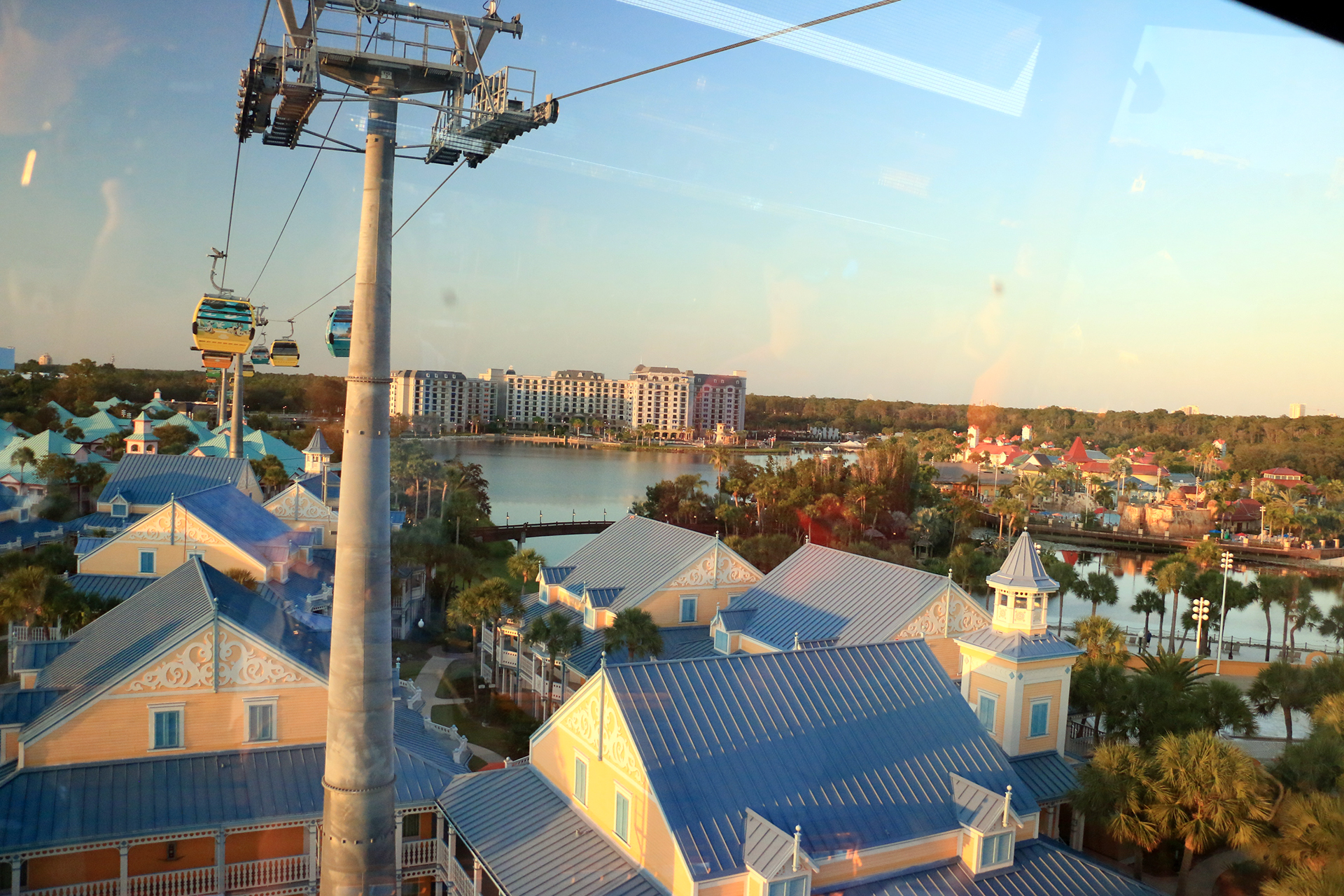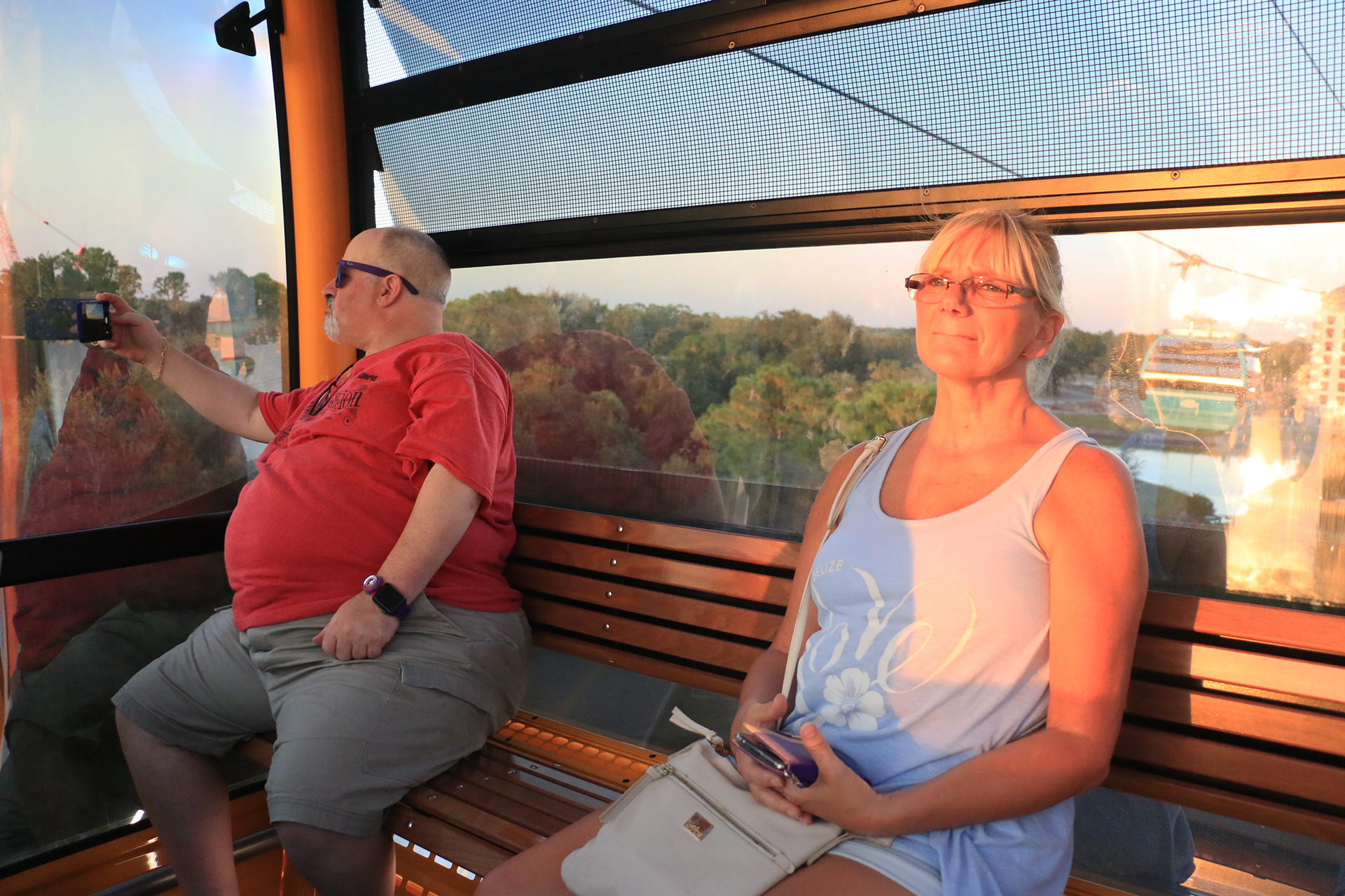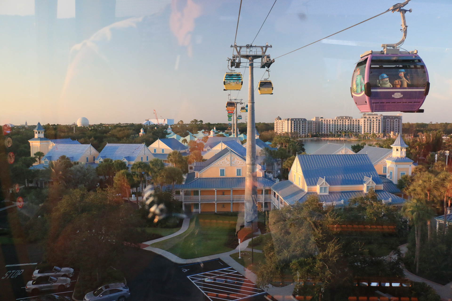 After entering our vehicle, it slowly and very quietly began its ascent. The views outside were spectacular. Now there is only one thing that for me, the jury is still out on. The gondolas are not air-conditioned, and Disney said that it should not be a concern in the Florida summer. The day we went, it was in the 90’s, but for the first time in many months, the humidity was very low. We got on at 6:30pm, still warm but not humid. The only ventilation in the gondolas are upper vents forward and back and as the Skyliner moves, there seems to be a good airflow. However, as the gondola made the slow turn towards EPCOT, in that brief time, it did get noticeable warmer. I will ride this on a very hot day and give a final opinion.