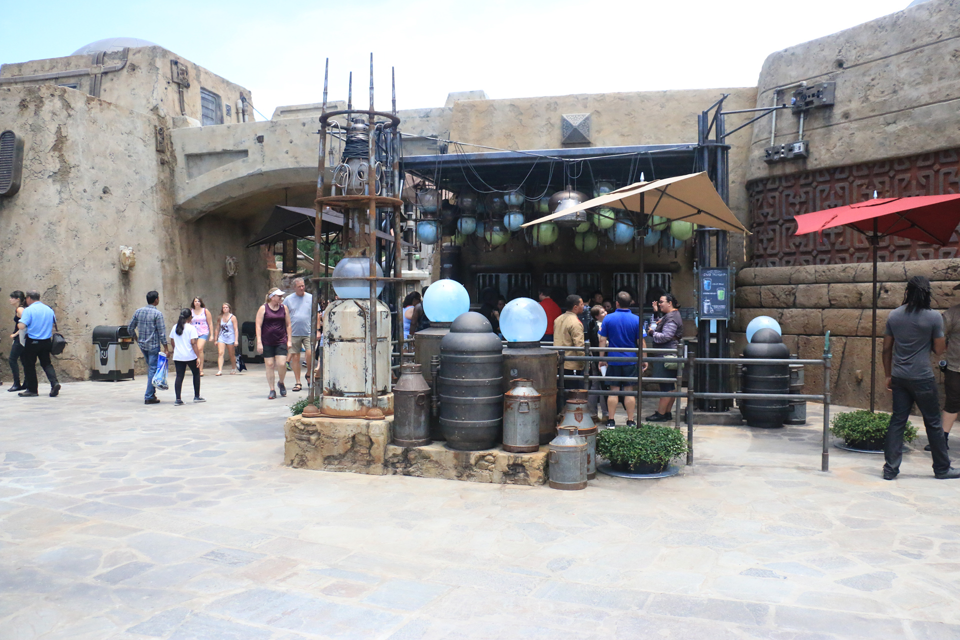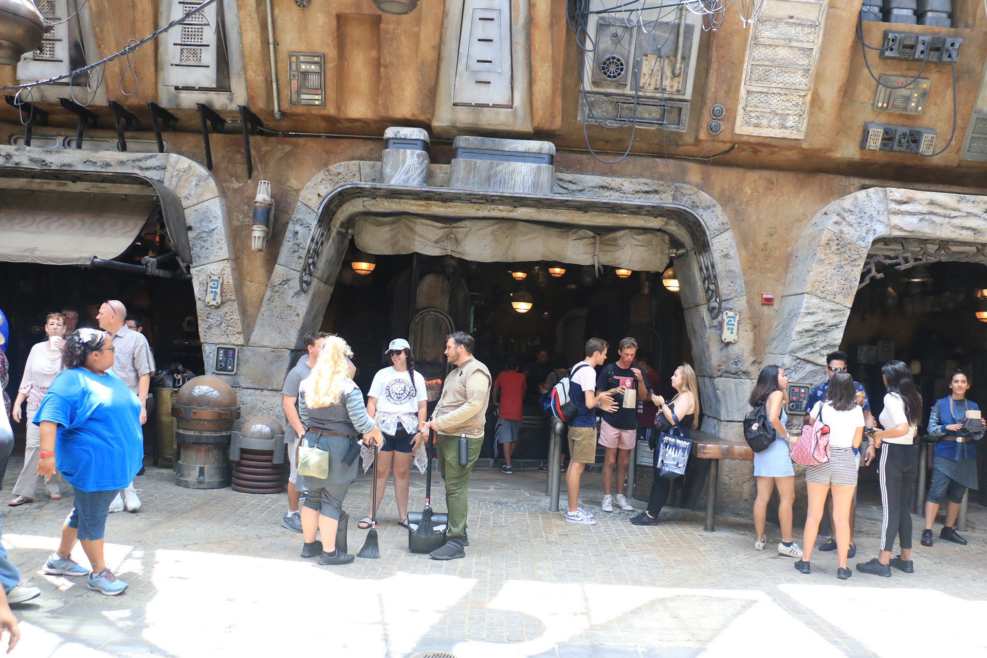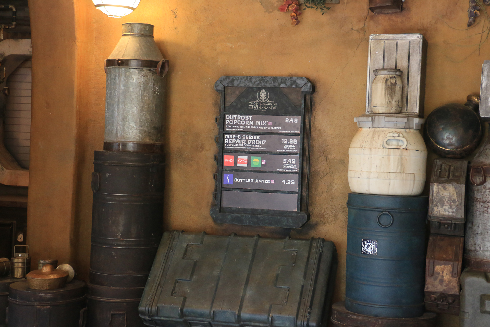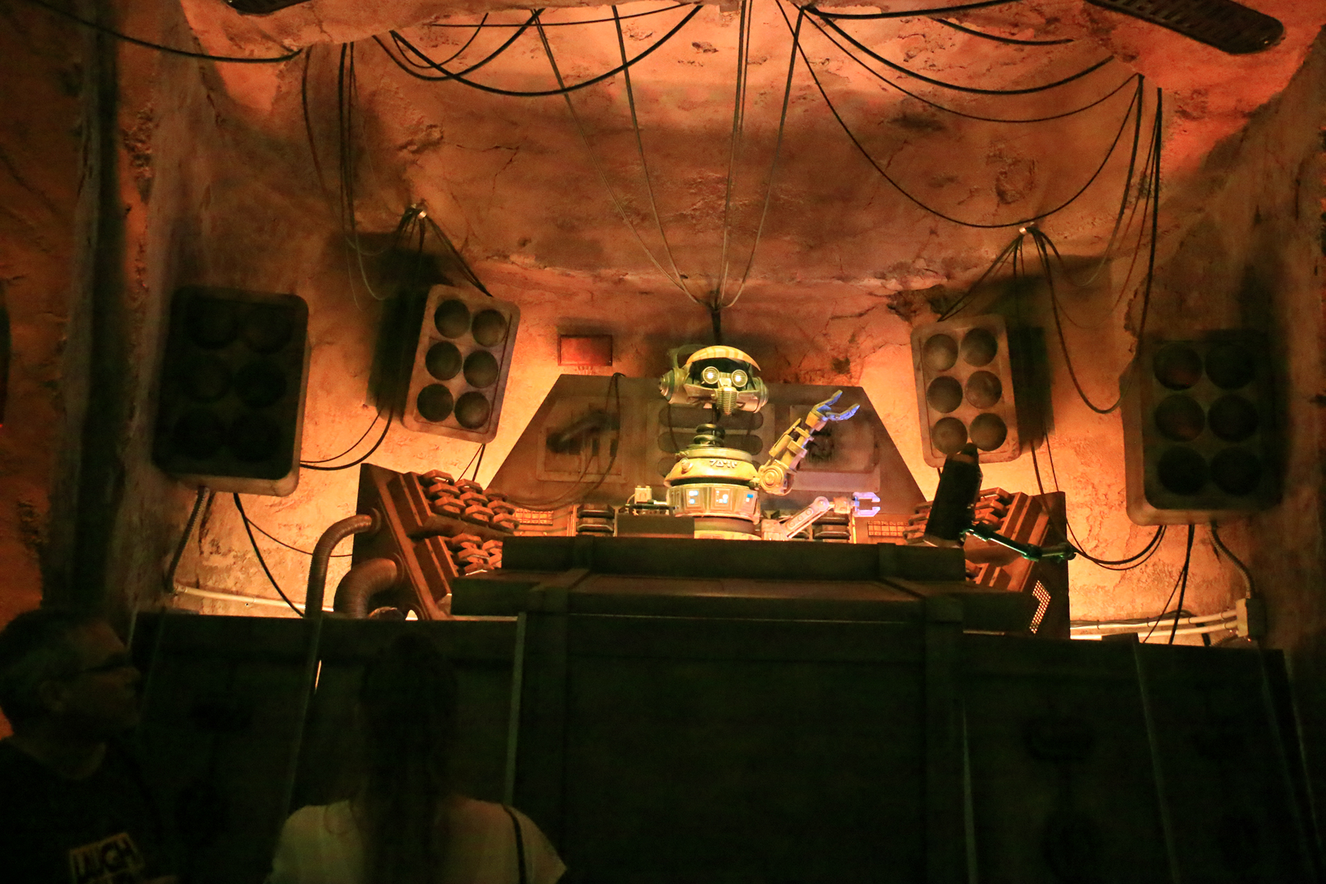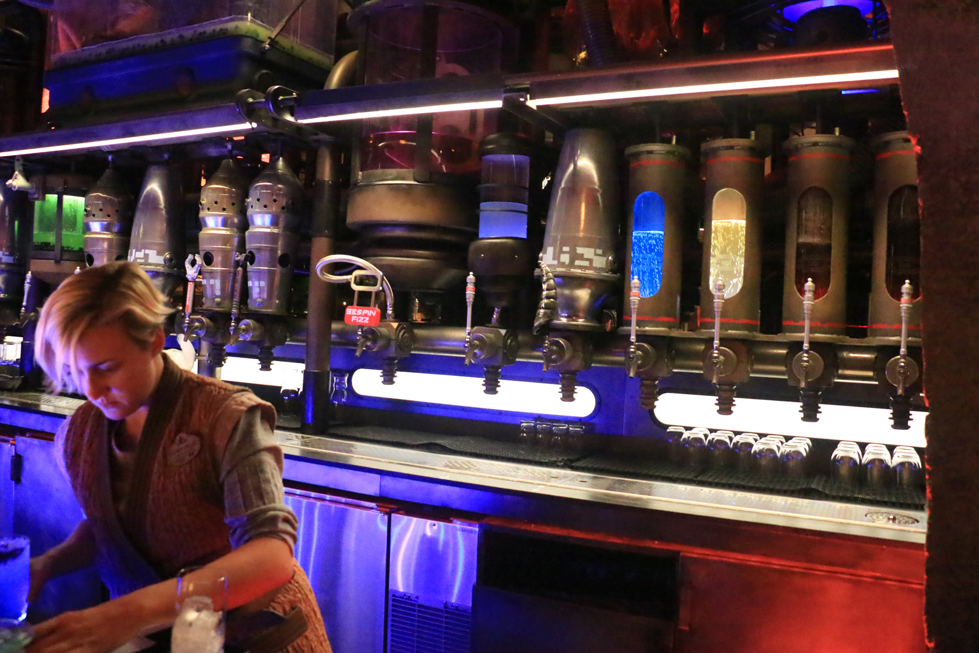 We loved Oga’s Cantina! Now remember, this is not the Mos Eisley Cantina in the Port of Mos Eisley on planet Tatoonie in the first Star Wars, A New Hope. You will not see that intergalactic band, but you will see the DJ R-3X (You will remember him as Captain Rex, again voiced by actor Paul Reubens) playing all your favorite Eighties synth-pop vibe tunes. There are Alcoholic and non-alcoholic offerings here. Again, take your time and observe all the amazing details and sights in the bar.