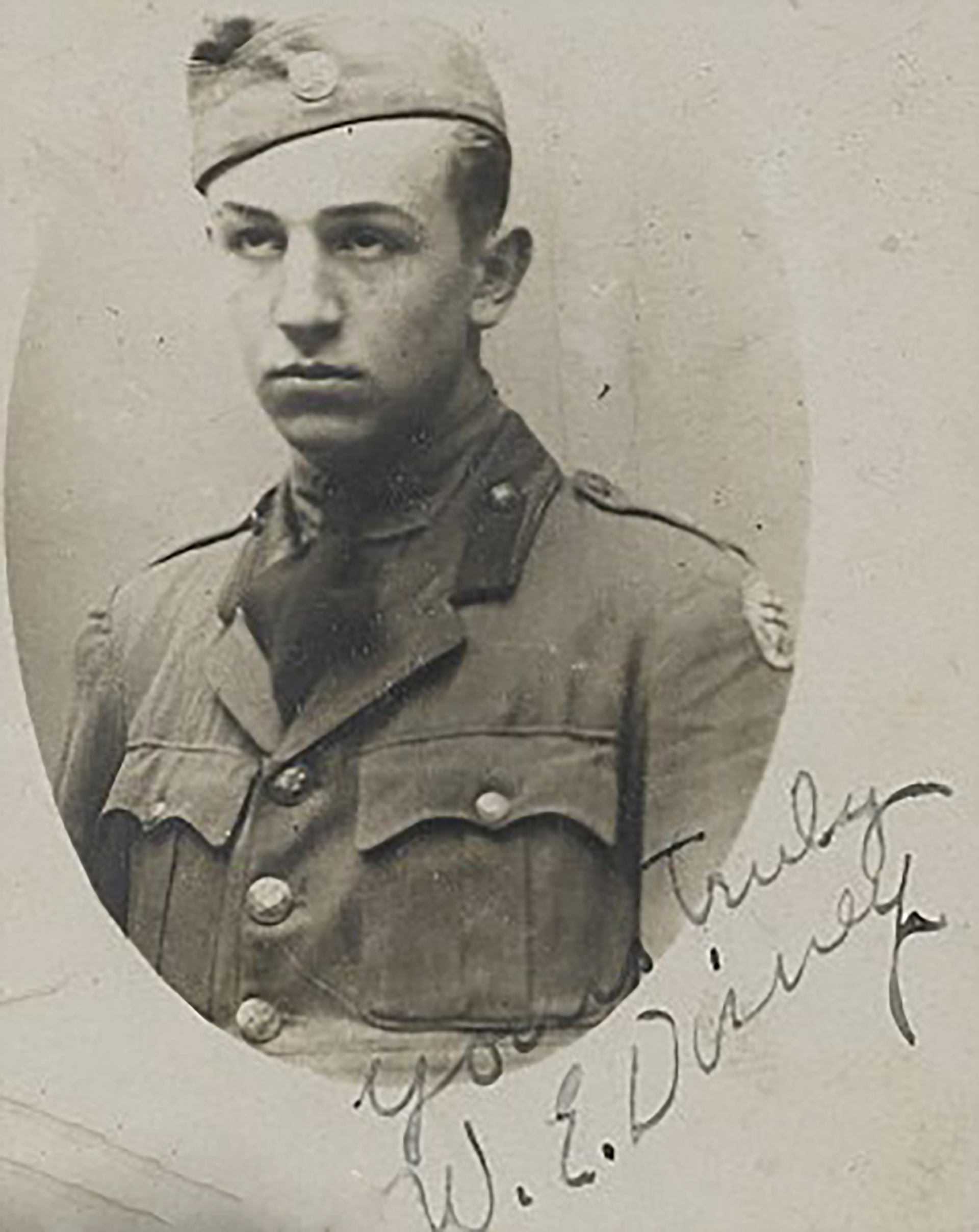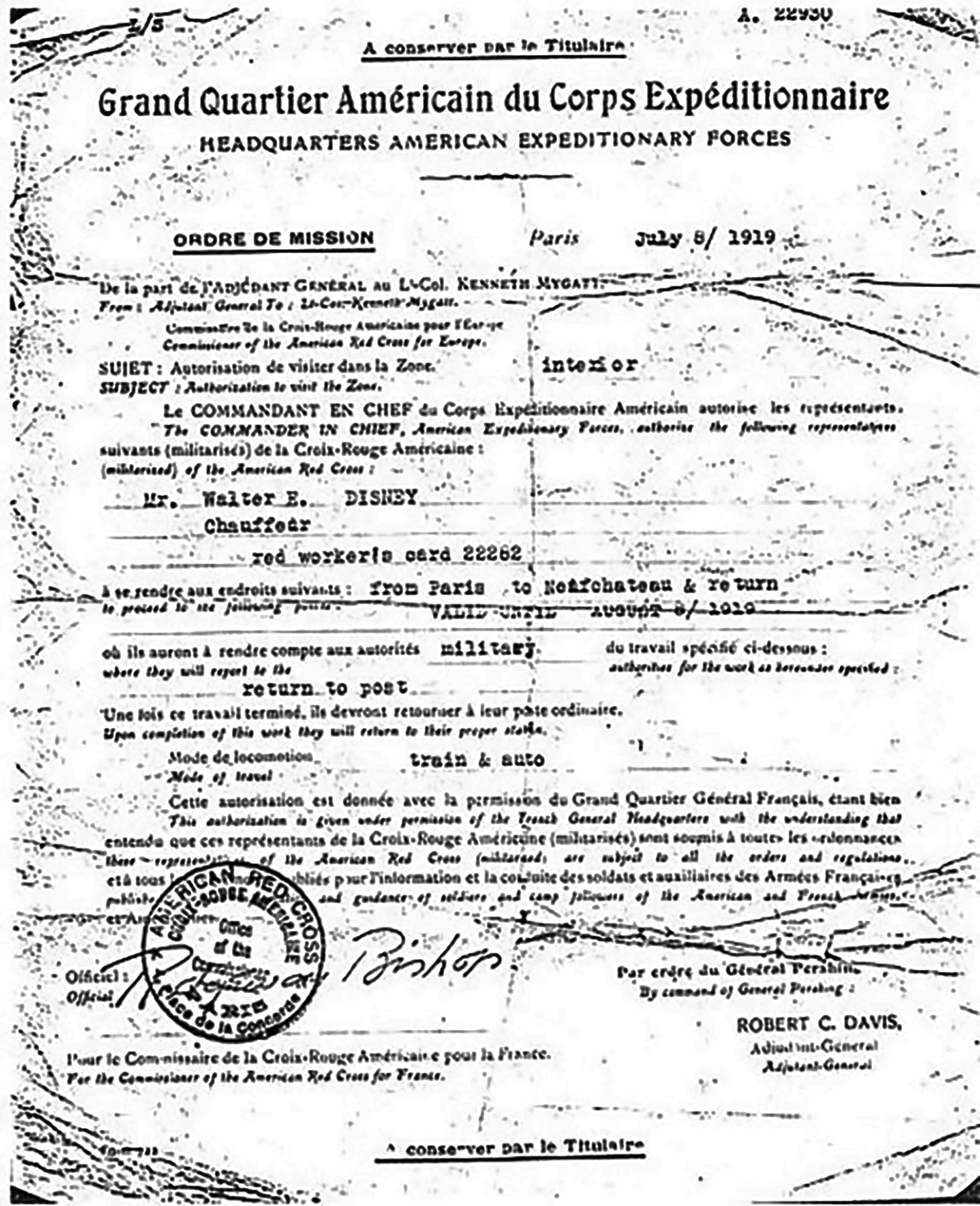 But their plan was discovered, and Walt affirmed his desire to serve, he pleaded, “I don’t want my grandchildren asking me, “Why weren’t you in the war?” “Were you a slacker?” Walt’s father Elias would have not part of it, saying…” I might be signing your death warrant”. Walt’s mother Flora had a different take on the subject… “Three of my sons have left this family in the middle of the night. Walter’s determined to go, Elias, even if he has to sneak out like his brothers. I’d rather sign this paper and know where he is.” Even so, Elias would not sign, saying… “Forge my name if you want, but I won’t sign!” And she did forge his name. And in keeping with the situation, one of Walt’s first artistic undertakings was altering his birth date on his passport, changing “1901” to “1900”. This historic document is now housed in the Disney Archives, and you can see the clear forgery if you look close. On September 16th, 1918, Walter Elias Disney enlisted as a member of the Ambulance Corps.
