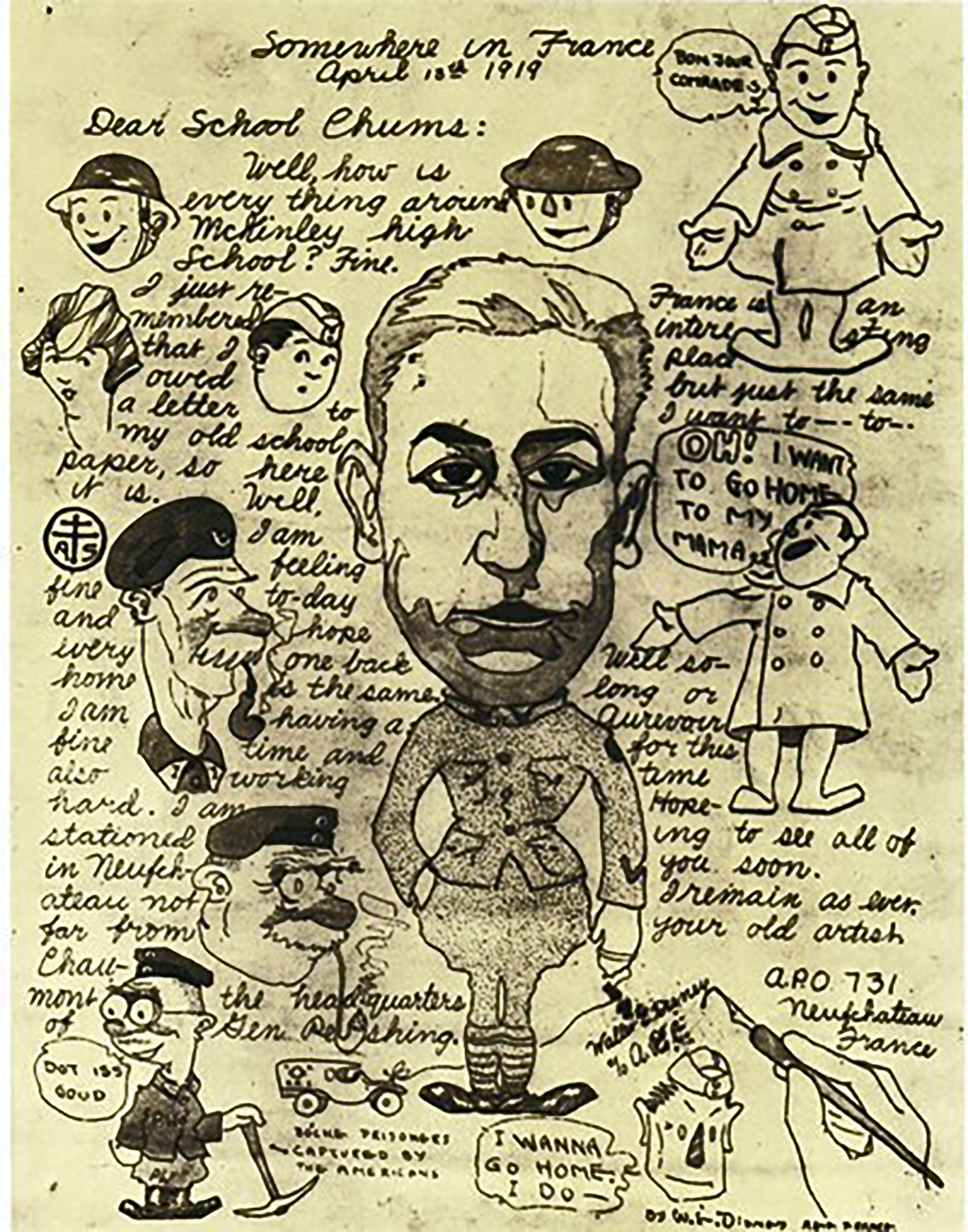 When Walt was not driving, he was drawing. He drew sketches for the canteen menu, designs on the canvas ambulance flaps, and caricatures for his friends to send to girlfriends and families. “I found out that the inside and outside of an ambulance is as good a place to draw as any,” Walt later recalled. He also sent funny and moving letters with sketches to The McKinley Voice, his high school newspaper. Walt and another driver teamed up and created a little sideline operation, selling souvenirs to soldiers heading home. They collected German helmets, and Walt, utilizing his artistic skills, converted them into rare German sniper helmets, making them look battle worn, banging them up, shooting bullet holes through them and even adding hair and dried blood. The boys made a lot of money in this operation.