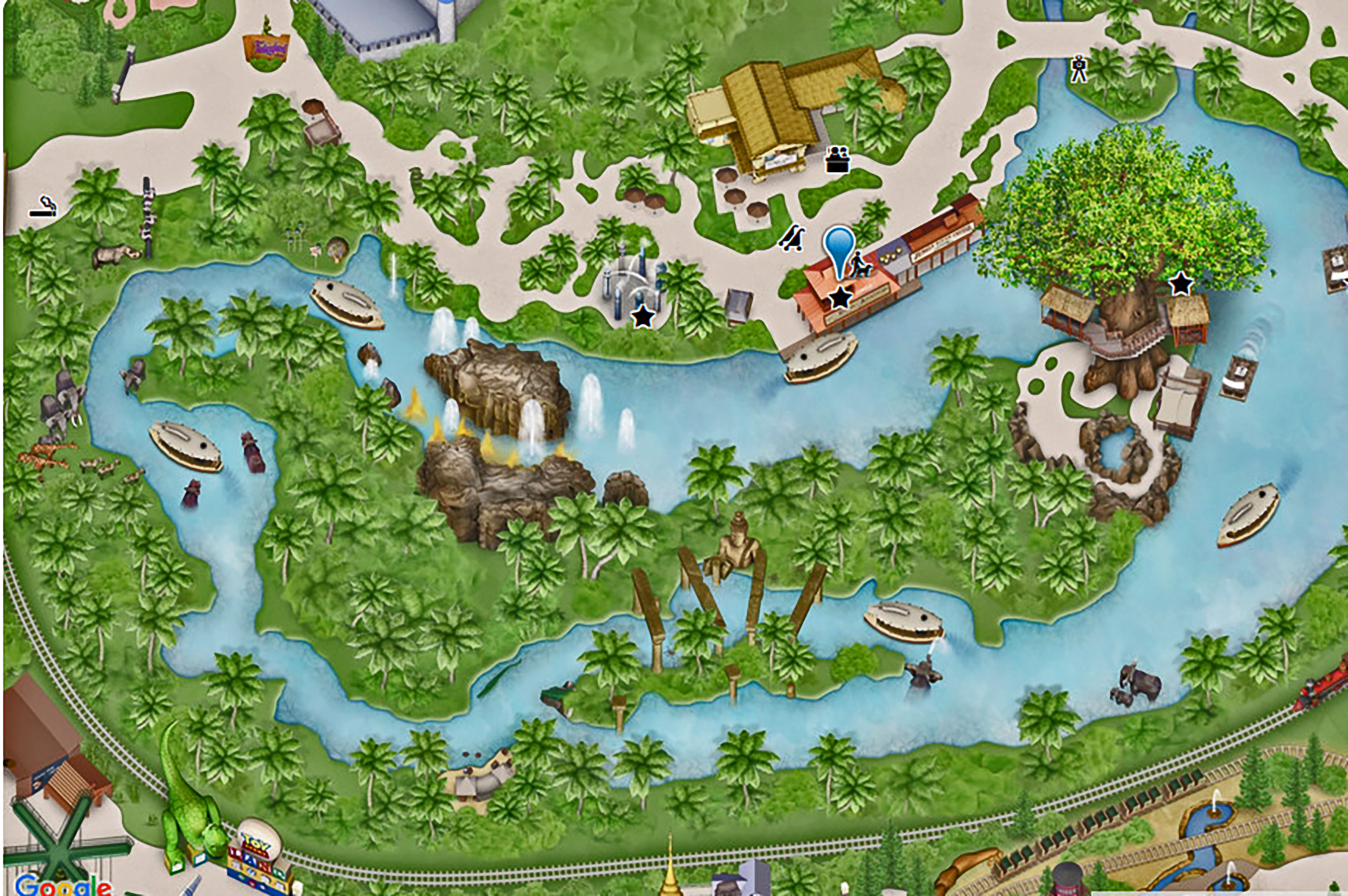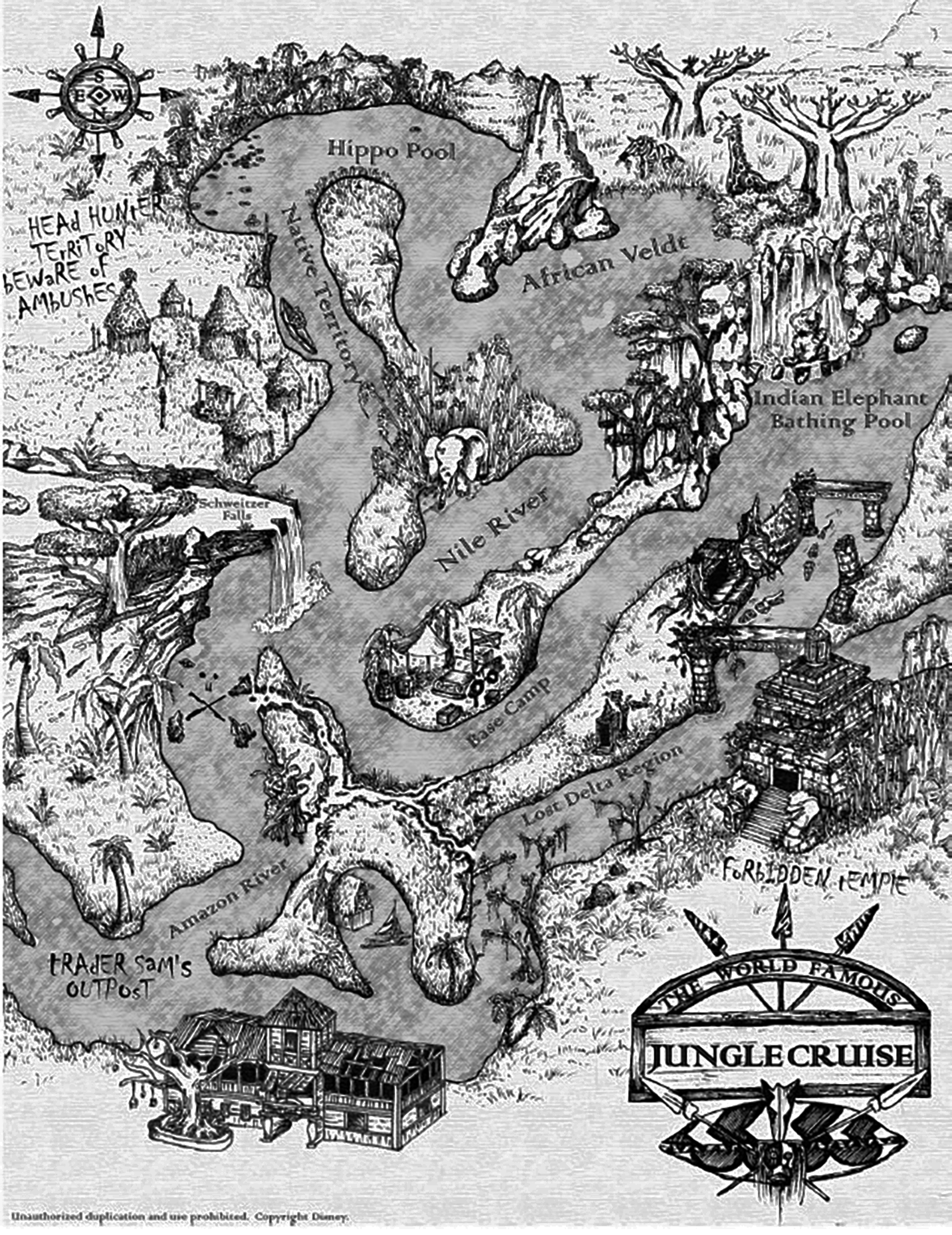 Here is the Disneyland Jungle Cruise itinerary…The outpost is again the Jungle Navigation Company, a British colony circa 1938. The queue has the period props and clutter, and routes upstairs. Period music plays along with jungle breaking news bulletins. In Disneyland, you first enter the Irrawaddy and Mekong rivers, aping Southwest Asia. You sail through a rainforest and enter the Temple of the Forbidden Eye, damaged by an ancient earthquake. Giant spiders, tigers, cobras and crocodiles are in evidence. You exit into the Sacred Indian Elephant Bathing pool, with elephants squirting water and bathing. African rivers are next, passing Schweitzer Falls, you enter the Nile, and approach the African Veldt with wildebeest, gazelles, giraffes, zebras and a pride of lions eating. Next up is the Rhino chasing the safari troupe up a pole. Now entering the Congo river and that pool of angry hippos, scared away with a gunshot by the skipper. You hear drums and chanting as native’s dance, then sail past an ambush from the river bank. You go under the “Backside of Water” and enter the Amazon, encountering a school of jumping piranha. Now guests pass water buffalo and a boa constrictor before meeting Trader Sam (Not Name’) who will give two of his heads for one of yours.
