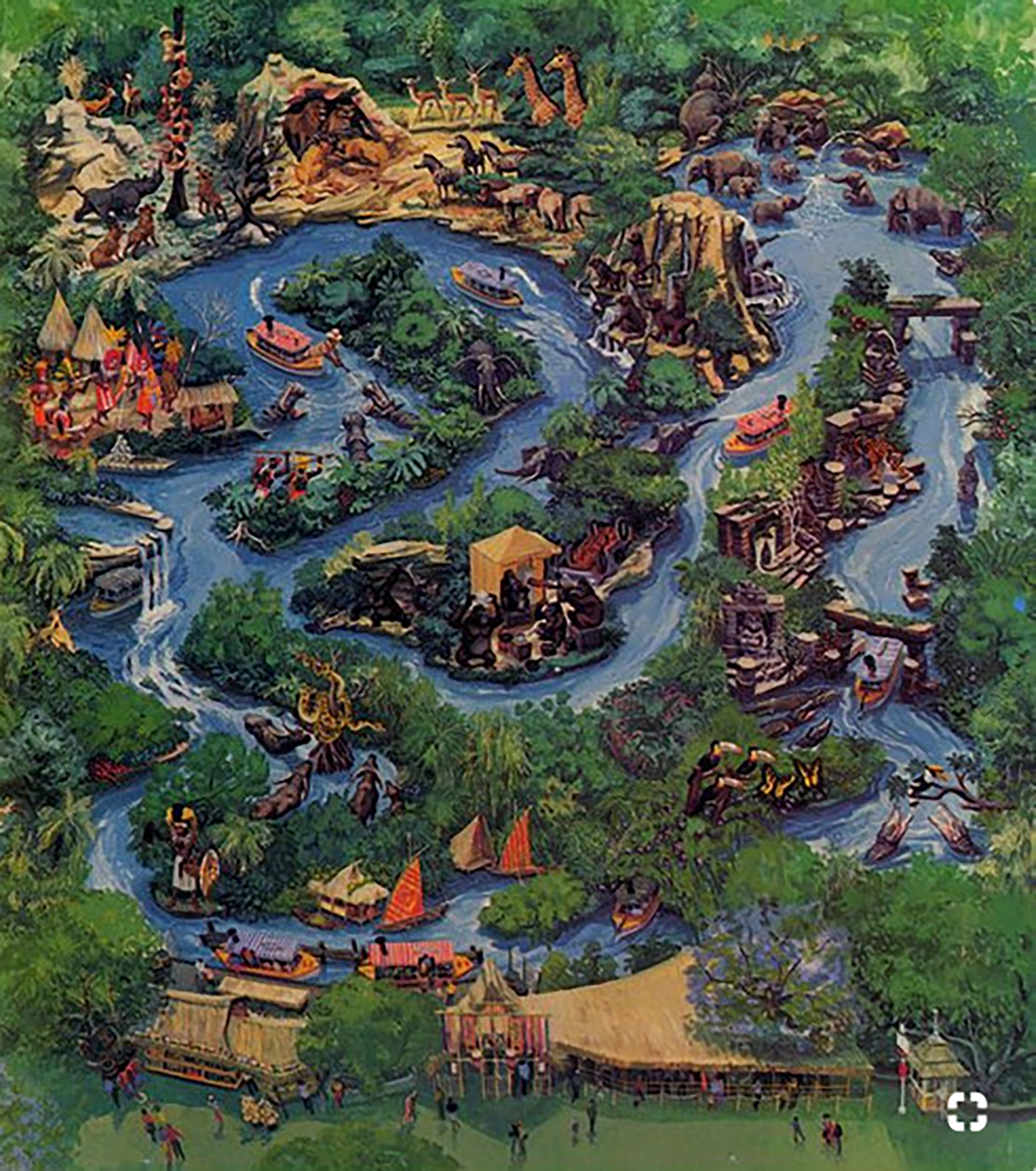 Bill Evans, Walt’s master Landscape Architect was the mastermind behind the attraction. He had to select a plethora of flora species that would be robust to counter Florida’s non-tropical mild winters, but still suggest a tropical feel. They need to appear correct, even if not normally grouped together. He had a herculean task of creating a believable jungle on a sparse budget. Aside from importing many actual tropical plants, he made wide use of “character plants” which, could give the appearance of exoticism in context. In a well-known trick, he uprooted local orange trees and “replanted” them upside-down, growing vines on the exposed roots. The Jungle Cruise has many sight gags, and no animator did it better than Marc Davis. He created Cruella De Ville, Princess Aurora and Tinker Bell. He had a flawless sense of timing, and his gag outlines often translated precisely into the attraction. The Indian Elephant Bathing Pool and Rhinoceros Chasing Explorers up a Pole were his contributions.